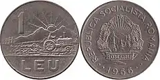 Stema Republicii Populare Române, reprezintă munți împăduriți, deasupra cărora se ridică soarele. În mijloc se află o sondă, iar în jurul stemei o coroană de spice de grâu. |