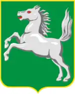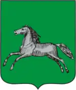 В зелёном поле восстающий серебряный конь. Девиз "ТРУДОМ И ЗНАНИЕМ" начертан зелёными литерами на серебряной ленте. Щит увенчан золотой башенной короной о пяти зубцах.