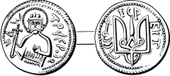 Геральдический знак «якорь-крест» на монете Киевского князя Владимира Ольгердовича. Год чеканки: 1388-1392