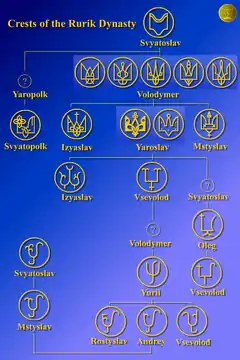 Существует несколько теорий о происхождении знака Владимира Великого, который сейчас называют тризубом. Самая распространённая из них — это стилизованное изображение сокола-Рарога, падающего на добычу — фамильный знак князей Рюриковичей[3]. Знаки Рюриковичей не являлись «средневековыми европейскими гербами», хотя бы потому, что средневековая геральдика возникла в Европе не ранее XII века[4]. Однако геральдика существовала и до средневековой Европы — с глубокой древности известны геральдические знаки правителей, богов, отдельных родов (например, тюркская тамга); религиозные знаки, которые входили в состав гербов. Подобные знаки наносились на стены крепостей, изображались на монетах, амулетах, перстнях и других предметах.