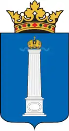 В лазоревом поле серебряная колонна с фигурной капителью и базой на постаменте, увенчанная Императорской короной с лазоревыми лентами, отходящими в стороны.