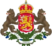 Герб Финляндии — коронованный золотой лев в червлёном поле, правая передняя лапа заменена рукой в доспехах, держащей серебряный меч с золотой рукоятью. Лев попирает задними лапами серебряную сарацинскую саблю с золотой рукоятью. Щит обременён 9 серебряными розетками (по числу исторических частей Финляндии). Официально используется только с 1978, хотя впервые появился около 1580 года на статуе шведского короля Густава I Вазы, установленной в готическом соборе шведского города Уппсала[1].