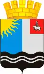 В лазорево-серебряно-черном рассеченном, пересеченном щите, в верхнем правом углу, выходящее на четверть золотое солнце с пламенеющими лучами, в левой вольной части - герб Пермского края, в оконечности - двойная серебряная волна. Щит увенчан золотой башенной короной о пяти видимых зубцах.