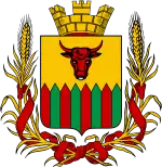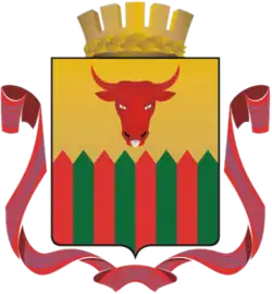 В золотом поле восьмиконечный палисад, червлёный с зеленью, сопровождаемый вверху червленой буйволовой головой с серебряными глазами и языком. Щит увенчан золотою башенною короною о пяти зубцах, окружённой по обручу золотым лавровым венком и обвит лентой ордена Октябрьской Революции