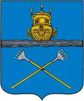 В лазоревом поле две серебряные на золотых рукоятях пятизубые остроги накрест.
