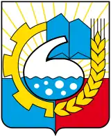 В щите изображены книга, реторта, колос, половина зубчатого колеса на фоне расходящихся лучей солнца. В нижней части щита синее и красное поля.