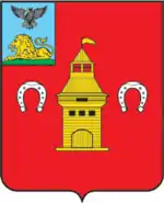 В червлёном поле золотая бревенчатая башня с закрытыми воротами, чёрными бойницами, золотыми шатровой кровлей и крытой шатром смотровой площадкой и прапором наверху, сопровождаемая по сторонам двумя серебряными подковами; в вольной части щита — герб Белгородской области