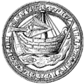 Название города в переводе со славянских языков означает «звук стрелы».[1]. Стрела на печатях и гербах города изображалась всегда. В XII-XV веках в разных формах на печатях города изображались корабль как символ порта и стрела.