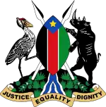 До провозглашения независимости страны, очень часто употреблялся герб, построенный по модели символов соседних Кении и Уганды. Щит традиционной африканской формы повторяет рисунок флага Южного Судана — дважды рассечен на черный, червленый и зеленый, разделенные тонкими серебряными полосками; в главе синий треугольник с золотой пятиконечной звездой. За щитом два африканских копья накрест. Щитодержателями выступали птица китоглав и чёрный носорог, стоящие на чёрном подножии с зелеными растениями с водным потоком в центре. На девизной ленте внизу начертано: «Справедливость, Равенство, Достоинство». |