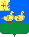 В лазоревом поле с повышенной зелёной выпуклой оконечностью две идущие влево золотые утки с червлёными глазами, клювами и лапами.