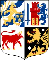Щит рассечённый и пересечённый, в первом лазоревом с тремя серебряными волнистыми влево перевязями поле золотой лев влево с раздвоенным хвостом, червлёным вооружением, в закрытой короне, держит в отведенной назад правой лапе золотой меч, а в левой — лазоревый щиток с тремя золотыми коронами (2:1); во втором серебряном поле — червлёная крепость с зубчатой башней и двумя закрытыми золотыми воротами, слева вздыбленный на неё лазоревый лев с золотым вооружением, а справа — лазоревый меч прямо острием вверх, в 3-м серебряном поле — червлёный бык с золотыми рогами, языком и копытами; в 4-м скошенном слева на чёрное и золотое поле — лев в обратных цветах с червлёным вооружением, в чёрном поле вверху слева и внизу справа — по серебряной шестилучевыми звезде.