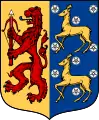Щит рассечён и пересечён, в первом и четвёртом золотых полях червлёный лев с лазоревым вооружением, держащий в передних лапах червлёный арбалет с чёрным луком и серебряным наконечником, во 2-м и 3-м лазоревых полях — золотой олень с червлёными рогами, воротником, языком и копытами.