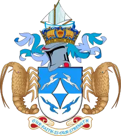 Герб представляет собой пересечённый на лазурь и серебро щит, в поле которого переменно окрашенный ромб, сопровождаемый переменно окрашенными альбатросами, по два в лазури и серебре. На щите серебряный шлем, увенчанный стилизованной морской короной. В нашлемнике лазоревая лодка. Щит поддерживают омары натурального цвета. Снизу серебряная лента, на которой лазоревыми литерами начертан девиз: «Our Faith Is Our Strength» (с англ. — «Наша вера — наша сила»).