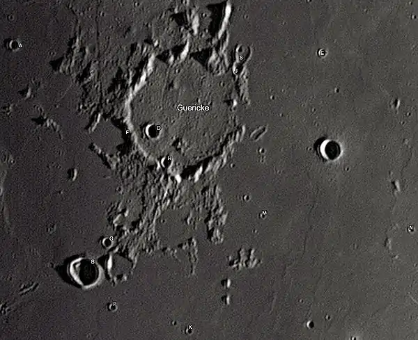 ![]() Снимок c борта Аполлона-16. Кратер Герике в нижней правой части снимка. В верхней части снимка кратеры Бонплан, Парри и, в самом верху, часть кратера Фра Мауро. В центре циркулярный кратер Толанский. | |