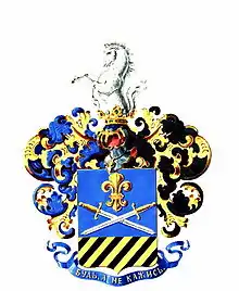 В лазуревом щите, два серебряных накрест положенных меча, с золотыми рукоятями, сопровождаемые вверху золотою лилиею. В золотой оконечности щита, шесть скошенных черных перевязей вправо.