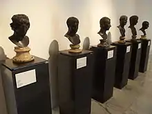 В ходе раскопок было обнаружено 67 статуй, бюстов, герм из бронзы и мрамора. Они концентрировались в четырех помещениях: в продолговатом перистиле, в тусканском атрии и в двух комнатах, находящихся между продолговатым и квадратным перистилями. В тусканском атрии, вокруг имплювия, находилось 10 бронзовых бюстов и один бюст в центре имплювия; кроме того, там были две мраморные базы без бюстов. В продолговатом перистиле (то есть в саду) зафиксировано 28 статуй и герм: это изображения атлетов, эллинистических правителей, гермы философов, богов и героев. В обширной комнате, через которую из квадратного перистиля открывался вид в сад, обнаружено девять скульптурных изображений — статуи жреца Исиды, фламина, бюстик Эпикура, бюст Геракла, статуя Афины, бюсты юноши, взрослого мужчины (предположительно Суллы), Демосфена и женщины. В комнате меньших размеров, находившейся к северу от описываемого помещения, находились бюсты Эпикура, его оппонента Зенона, Демосфена и Гермарха.