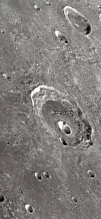 - Сателлитный кратер Геркулес Е имеет эллиптическую форму, дно его чаши треугольной формы[6]. Необычная морфология кратера может объясняться низким углом импакта.