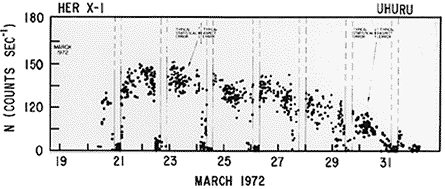Объявление об обнаружении источника Геркулес X-1 при наблюдениях на спутнике Uhuru было сделано на конференции «1971-72 Winter Meeting of the High-Energy Astrophysics Division AAS», проводимой в Сан-Хуане[7]. Само же открытие периодически пульсирующего рентгеновского источника произошло в ноябре 1971 года[8].