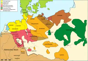 Первые упоминания о древних германцах появились в трудах древних греков и римлян. Одно из первых упоминаний о германцах относится к 98 году. Оно было сделано римским летописцем Тацитом (лат. Tacitus). Вся территория современной Германии к востоку от Эльбы (славянской Лабы) до X века была заселена славянскими племенами[22]. (см. подробнее: полабские славяне). К XII—XIV векам эти земли постепенно вошли в состав тех или иных немецких государственных образований, составлявших так называемую Священную Римскую Империю. По мере пребывания этих территорий в составе немецких государств за несколько столетий местные славяне постепенно практически полностью были ассимилированы немцами. Этот процесс растянулся до позднего Средневековья и начала нового времени, а местами, с последним, ещё не до конца ассимилированным славянским народом Германии — лужичанами, длится до сих пор.