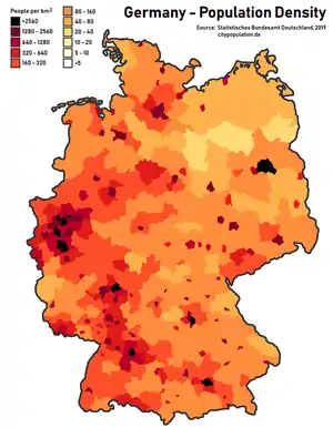 Самыми крупными городами Германии являются Берлин, Гамбург, Мюнхен и Кёльн. Следующим по значимости является пятый по численности населения город Германии и финансовая метрополия Франкфурт-на-Майне, самый крупный аэропорт Германии. Это третий по размерам аэропорт Европы и первый по объёмам прибыли от грузовых авиаперевозок. Рурский бассейн — регион с самой высокой плотностью населения.
