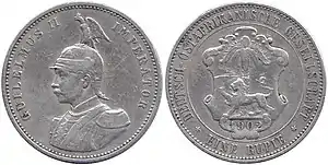 Монеты с легендой Deutsch Ostafrika чеканились в Берлине и Гамбурге (обозначения монетных дворов соответственно A и J). Чеканились монеты в 1⁄2, 1, 5, 10 геллеров, 1⁄4, 1⁄2, 1 рупию[2].
