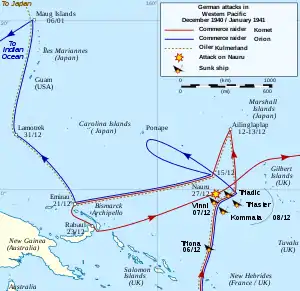 В конце октября 1940 года немецкий рейдер «Орион»[5], которым командовал капитан Курт Вайер, у Каролинских островов встретил крейсер «Комет»[6] под командованием капитана Роберта Эйссена и корабль снабжения Кулмерланд. Эйссен был более старшим из двух капитанов и принял общее командование кораблями[7]. Три судна выдвинулись вдоль восточного побережья Новой Зеландии и в течение 18 дней в ноябре затопили небольшие каботажные судна Holmwood и большой вооружённый океанский лайнер Rangitane[8]. После этих нападений рейдеры отправились на острова Кермадек, а затем к Науру, чтобы атаковать фосфатную промышленность острова и дрейфующие суда, о которых знали немецкие капитаны[7].