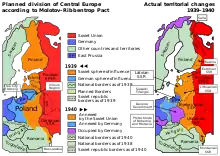 23 августа 1939 года немецкая делегация во главе с министром иностранных дел Иоахимом фон Риббентропом прибыла в Москву, а ночью следующего дня между ним и его советским коллегой Вячеславом Молотовым в присутствии советского лидера Иосифа Сталина был подписан пакт Молотова-Риббентропа.[103] Десятилетний пакт о ненападении декларировал неизменную приверженность обеих сторон Берлинскому договору (1926), однако к пакту был приложен секретный дополнительный протокол, который разделил Восточную Европу на германскую и советскую зоны влияния:[104]