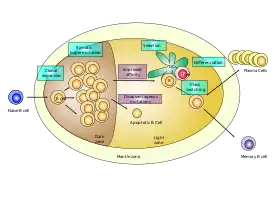 В структуре герминативного центра выделяют три зоны: тёмную, базальную светлую и апикальную светлую. В тёмной зоне происходит первичная пролиферация активированных B-лимфоцитов. В базальной светлой зоне лимфоциты проходят процесс селекции на автореактивность, в результате которой либо получают сигнал к инициации апоптоза, либо выживают и перемещаются в апикальную светлую зону. В апикальной светлой зоне происходит дифференцировка выживших клеток в плазматические клетки или В-клетки памяти[2].