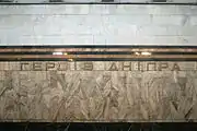 «Украинизированное» название станции на путевой стене, видны очертания букв русского названия