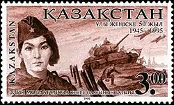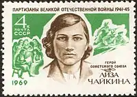 Во время Великой Отечественной войны были изданы три серии почтовых марок СССР под общим названием «Герои Советского Союза, павшие в Великой Отечественной войне 1941—1945 гг.». Первый выпуск, появившийся в ноябре 1942 года, содержал две марки одинакового рисунка, но разного цвета и номинала, посвящённые подвигу Зои Космодемьянской. На марках второго выпуска, вышедших в апреле 1944 года, снова изображена Зоя Космодемьянская и участники подпольной организации «Молодая гвардия», среди которых Ульяна Громова и Любовь Шевцова. Одна из марок третьего выпуска (октябрь 1944 года) посвящена снайперам Марии Поливановой и Наташе Ковшовой[5].