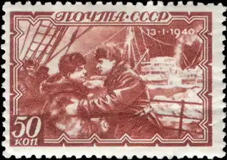 25 января 1935 года вышла серия почтовых марок СССР, посвящённых героям челюскинской эпопеи[1]. Прозванная филателистами «челюскинской», она стала первой серией, которая увековечила подвиги Героев Советского Союза. Художник В. Завьялов изобразил на марках портреты первых Героев Советского Союза и эпизоды спасения полярников. Марка номиналом в 5 копеек посвящена первому Герою А. В. Ляпидевскому, первым долетевшему до лагеря полярников (на марке показана посадка его АНТ-4 на льдину) и вывезшему женщин и детей. На 10-копеечной марке изображён С. А. Леваневский и его неудачная посадка на торосы Колючинской губы[2]. На марке номиналом в 15 копеек — портрет М. Т. Слепнёва и момент посадки тяжело больного начальника экспедиции О. Ю. Шмидта в самолёт. Лётчик перевёз его в Ном на Аляске для оказания медицинской помощи. Марка номиналом в 20 копеек изображает И. В. Доронина, сумевшего совершить посадку на одной лыже, не повредив самолёт. 25-копеечная миниатюра посвящена М. В. Водопьянову, сумевшему за два дня (12 и 13 апреля) выполнить три рейса на льдину. Момент завершающего полёта и запечатлён на марке. На марке достоинством в 30 копеек — портрет В. С. Молокова, который на своём самолёте Р-5 с бортовым номером «2» вывез со льдины 39 человек, и момент очередной посадки на ледовый аэродром[1]. Предпоследняя[3] марка в серии номиналом в 40 копеек демонстрирует портрет командира авиаотряда Н. П. Каманина и один из последних моментов челюскинской эпопеи, когда боцман Загорский с собаками идёт к воздушному судну Каманина[1].