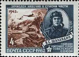 В феврале 1960 года в СССР начался выпуск почтовых марок большой серии под названием «Герои Великой Отечественной войны, зачисленные навечно в списки воинских частей». Для марок этой серии, выходившей на протяжении ряда лет, характерна надпись «Зачислен навечно в списки части». Во времена СССР зачисление героев в списки воинских частей производилось приказами министра обороны СССР в знак признания совершения особо выдающегося подвига. На многих марках этой серии изображены Герои Советского Союза. В 1960 году вышли две марки, посвящённые Герою Советского Союза лётчику-истребителю Т. М. Фрунзе и дважды Герою Советского Союза генералу армии И. Д. Черняховскому. В 1961 году появилась марка в память о подвиге Героя Советского Союза сержанта В. П. Мирошниченко, ценой собственной жизни взорвавшего мост через реку Снопоть. В феврале 1962 года были изданы ещё две марки, запечатлевшие подвиг Героя Советского Союза танкиста гвардии лейтенанта В. С. Шаландина и подводника капитана 2-го ранга М. И. Гаджиева. Автором рисунков всех этих марок был художник Л. Голованов[6].