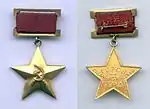 Медаль имеет форму рельефной пятиконечной звезды диаметром 32 мм. В центре аверса помещены скрещенные серп и молот. В центре реверса надпись в четыре строки: «ГЕРОЙ / НА / СОЦИАЛИСТИЧЕСКИЯ / ТРУД».