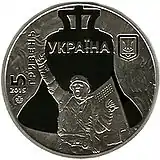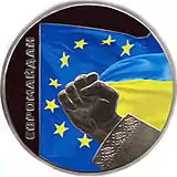 На аверсе: на рельефном фоне, стилизованном под флаг, вверху — надпись «УКРАЇНА» и государственный герб Украины, слева — надписи «5 ГРИВЕНЬ 2015», внизу — логотип Монетного двора НБУ. В центре — квадрат с надписью «НОСІЄМ СУВЕРЕНІТЕТУ І ЄДИНИМ ДЖЕРЕЛОМ ВЛАДИ В УКРАЇНІ Є НАРОД» (цитата из ст. 5 Конституции Украины), внутри квадрата — группа людей. На реверсе: на фоне флага Европейского Союза — кулак, сжимающий флаг Украины. Слева — надпись «ЄВРОМАЙДАН». |