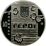 На аверсе: на фоне брусчатки — государственный герб Украины, гвоздики, надпись «ГЕРОЇ НЕ ВМИРАЮТЬ!». Слева — надписи «5 ГРИВЕНЬ 2015», справа — логотип Монетного двора НБУ. На реверсе: внизу — свечи, пламя которых поднимается вверх на фоне государственного флага Украины. Вверху — надпись «НЕБЕСНА СОТНЯ». |