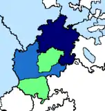 На 18 августа 1866 года после австро-прусской войны под прусский контроль попали Курфюршество Гессен (Гессен-Кассель) (кроме нескольких общин), герцогство Нассау (тоже за исключением некоторых частей), Вольный город Франкфурт (кроме двух общин) и баварские нижнефранконские эксклавы. Кроме того, Великое герцогство Гессен (Гессен-Дармштадт) было вынуждено уступить Пруссии территорию бывшего ландграфства Гессен-Гомбург, а также владение Шмалькальден и несколько других мелких участков[1].