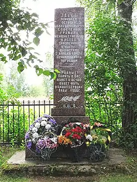 | «Перед пасхой (апрель 1942 года) немцы учинили чудовищную расправу над пленными. Группами по 200 и более человек гитлеровцы выводили их к противотанковому рву, раздевали догола, приказывали ложиться, а затем расстреливали из пулеметов и автоматов. Многих детей бросали в ров живыми и закапывали вместе с расстрелянными. Некоторым детям перед мученической смертью немцы ударом о колено переламывали позвоночник, руки, ноги. („А маленьких детей сначала переламывали об колено и бросали вниз“[2]…) Общее руководство расстрелом и сам расстрел осуществляли отряд СС, которым командовал обервахмистр Генрих Буль»[5]. |