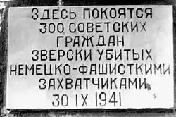В братской могиле оказались и раненые, засыпанные землёй заживо[5]. Немцы приказали охранять могилу, чтобы не дать никому спастись, и сразу после расстрела устроили праздничное застолье — вместе с «бобиками» (так в народе презрительно называли полицаев[6][7]) пили и плясали.