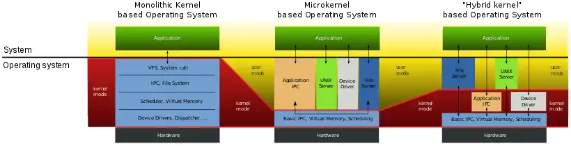 Существуют варианты ОС GNU (Debian GNU/Hurd), в которых вместо монолитного ядра применяется ядро Mach (такое же, как в Hurd), а поверх него в пользовательском пространстве работают те же самые процессы, которые при использовании Linux были бы частью ядра. Другим примером смешанного подхода может служить возможность запуска операционной системы с монолитным ядром под управлением микроядра. Так устроены 4.4BSD и MkLinux, основанные на микроядре Mach. Микроядро обеспечивает управление виртуальной памятью и работу низкоуровневых драйверов. Все остальные функции, в том числе взаимодействие с прикладными программами, осуществляется монолитным ядром. Данный подход сформировался в результате попыток использовать преимущества микроядерной архитектуры, сохраняя по возможности хорошо отлаженный код монолитного ядра.