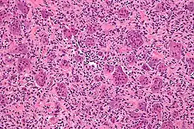![]() Микрофотография гигантских клеток остеобластокластомы кости, характерно выделяются гигантские клетки. Окрашено гематоксилином и эозином. | |