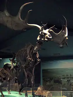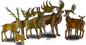 ![]() Виды гигантских оленей (слева направо): M. savini, M. cazioti, M. obscurus, M. pachyosteus, M. giganteus и M. verticornis | ||||||||||