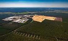 Простираясь к северу от логистического центра «GVZ Freienbrink» площадью в 1 квадратный километр (0,4 кв. мили),[49][50][51] этот район представляет собой неосвоенный участок площадью 3 км² (1,2 кв. мили), обозначенный как промышленная зона.[52] Примерно в 2000 году здесь планировалось разместить автомобильный завод BMW, но вместо этого BMW выбрала Саксонию.[53] «GVZ Freienbrink» окружают гораздо более крупные сосновые насаждения в ландшафтном масштабе.[54] На этом участке находится государственный искусственный лес из низкокачественных монокультурных сосен[55][56]. Власти ожидают, что Tesla смягчит последствия вырубки, посадив новые деревья более разнообразных сортов.[57][58][59] Старые неразорвавшиеся боеприпасы затрудняют расчистку территории,[60][61] и 26 января семь боеприпасов (всего 85 кг) были обезврежены в результате контролируемого взрыва.[62]