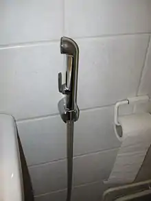 Гигиенический душ используют мусульмане в мусульманских странах, в арабском мире, а также в Азии для очистки после посещения туалета. [4] Здесь вода обычно используется вместо туалетной бумаги или вместе с ней для очистки после дефекации.