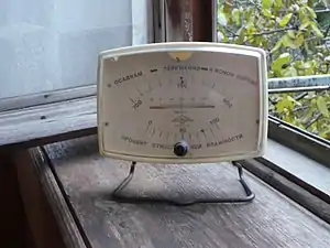 Бытовая метеостанция производства СССР, включающая гигрометр волосного типа (нижняя шкала с красной стрелкой). Текущее показание — 80 % относительной влажности.