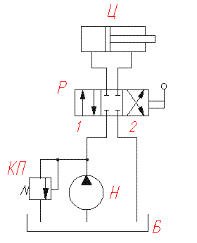 На рисунке 2 показана простейшая гидросхема. В показанном положении распределителя (Р) жидкость от насоса (Н) к гидроцилиндру (Ц) не поступает, и идёт транзитом , через распределитель в гидробак. В случае , аварии, через защитный клапан, в гидробак*. Если оператор перемещает ручку гидрораспределителя таким образом, что запорно-регулирующий элемент смещается в положение 1, то рабочая жидкость поступает в поршневую полость гидроцилиндра и поршень движется вправо, а жидкость из штоковой полости гидроцилиндра идёт на слив (направления движения рабочей жидкости через распределитель указаны стрелками). Если оператор возвращает ручку гидрораспределителя в исходное положение, то поршень гидроцилиндра останавливается, и рабочая жидкость опять идёт на слив в бак. Чтобы поршень гидроцилиндра начал движение влево, оператору необходимо переместить ручку распределителя таким образом, чтобы запорно-регулирующий элемент сместился в положение 2.