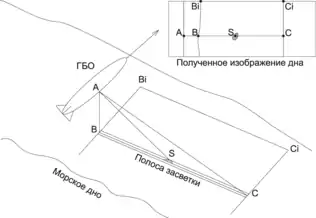 ГБО посылает в направлении дна акустический луч. Достигнув препятствия, акустическая энергия переотражается и возвращается на приемную антенну гидролокатора. Наклонное расстояние от приемоизлучателя до препятствия равняется S = сT/2, где с - скорость звука в воде, Т - время между посылкой передающей антенной ГБО акустического луча и детектированием приемной антенной ГБО отраженного сигнала. Поскольку ширина луча в продольной плоскости достигает значительных размеров, на дне образуется широкая и узкая полоса засветки. При этом различные неоднородности дна имеют разную отражающую способность, т.е. амплитуда сигнала от разных препятствий будет отличаться.