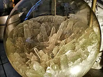 Кристаллы кислого сульфата калия на дне колбы, в которой получали концентрированную азотную кислоту из калийной селитры и концентрированной серной кислоты