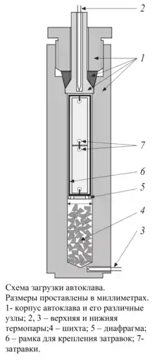 Процесс роста кристаллов в гидротермальных условиях происходит при высоких температурах и давлениях. Поэтому этот процесс ведут в специальных толстостенных сосудах – автоклавах, изготовленных из специальной высокопрочной коррозионно- и жаропрочной стали. Изображенный на рисунке автоклав не велик, его рабочий объем около 250 мл, что позволяет выращивать за один ростовой цикл около 100 г кристаллов изумруда. Автоклавы для гидротермального роста кристаллов кварца, например, гораздо больше – до 6 м3 и они позволяют выращивать до полтонны кристаллов за один ростовой цикл.