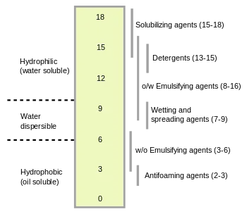 где — молекулярная масса гидрофильной части молекулы, а — молекулярная масса всей молекулы. Формула даёт результат по шкале от 0 до 20. Значение ГЛБ 0 соответствует полностью липофильным (гидрофобным) молекулам, а значение 20 соответствует полностью гидрофильным (липофобным) молекулам.