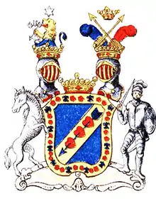 На щите баронская корона и по бокам её два шлема с баронскими же коронами. Из правого шлема выходить вправо обращенный лев, нижняя половина коего голубая; держит в правой лапе три стрелы, а над головой льва серебряная шестиугольная звезда. Из левого шлема выходят два страусовых пера, правое голубое, левое красное; между ними, крестообразно, две серебряных стрелы, остриями вверх, и между стрелами, на воздухе, дворянская корона. Щит держат: справа белый конь; слева воин в одежде средних веков, с мечом в правой и с зелёным щитом в левой рук. Девиз: et corde et ore.
